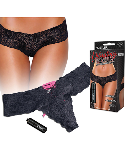 Hustler Vibrating Panties w/Hidden Vibe Pocket, Bullet & Stimulation Beads Black S/M